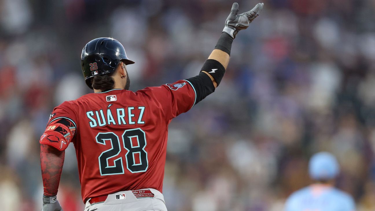 Arizona Diamondbacks third baseman Eugenio Suarez reached a major career milestone by hitting his 300th home run during a 14-8 victory over the Colorado Rockies, marking him as the third Venezuelan-born player to reach this mark. Suarez, who has been a powerful offensive force with 24 home runs and a major league-leading 65 RBIs this season, homered in consecutive innings and has demonstrated continued power after a slow start to the season. The Diamondbacks, currently fourth in the NL West, continue to perform well offensively with the second-best team slugging percentage in the majors. Despite interest from other teams targeting Suarez as a trade acquisition, the Diamondbacks insist they are not sellers at the trade deadline and remain committed to competing this season. Other contributors in recent games include Geraldo Perdomo and Ketel Marte, who have added key hits and home runs, while pitcher Merrill Kelly has been effective on the mound. The team is managing some injuries cautiously, including outfielder Corbin Carroll and reliever A.J. Puk, the latter undergoing an internal brace procedure expected to reduce recovery time compared to traditional Tommy John surgery.